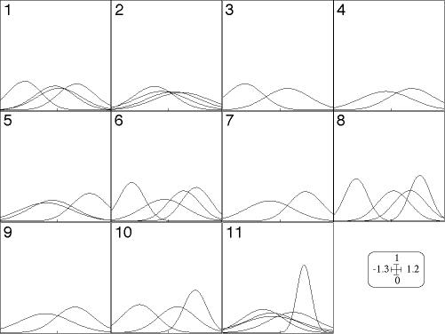 Fig. 3. Example of graphic drawn with the Graph1DClass module: the eleven elementary graphics (numbered 1 to 11) correspond to eleven qualitative variables. In each elementary graphic, the Gauss curves represent the distribution of the samples belonging to the categories of each qualitative variable. For example, graphic number seven corresponds to the seventh qualitative variable, which have two categories. The two Gauss curves represent the mean and the variance of the samples belonging to each of these two categories. Only one quantitative variable of the data table is represented here. In this module, elementary graphics of a collection corresponding to groups of rows are superimposed, while graphics corresponding to the qualitative variables are placed side by side. Graphics corresponding to other columns of the data table (quantitative variables) would also be placed side by side.
